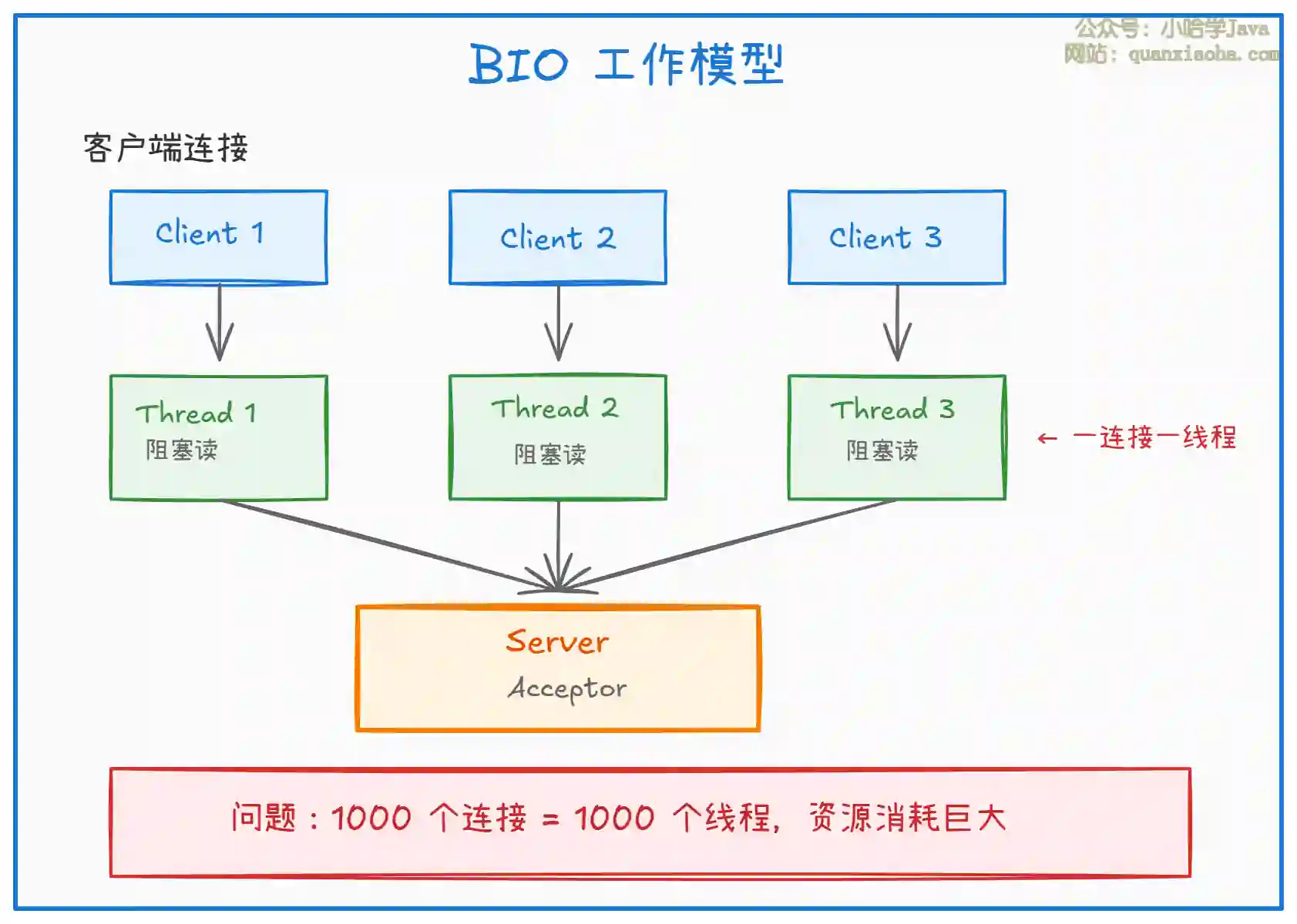 read()、accept()时会阻塞,直到有数据可读或有新连接 - 资源浪费:大量线程处于阻塞状态,白白占用内存和 CPU