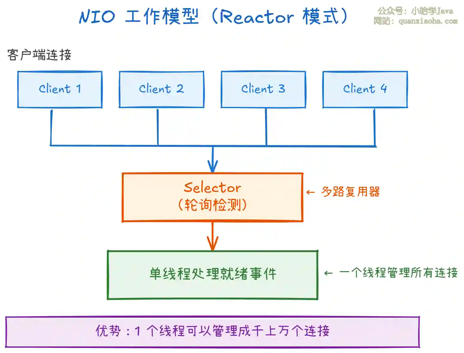 NIO 引入了 多路复用器(Selector),一个线程可以管理多个连接,通过轮询检查哪些连接有数据可读。