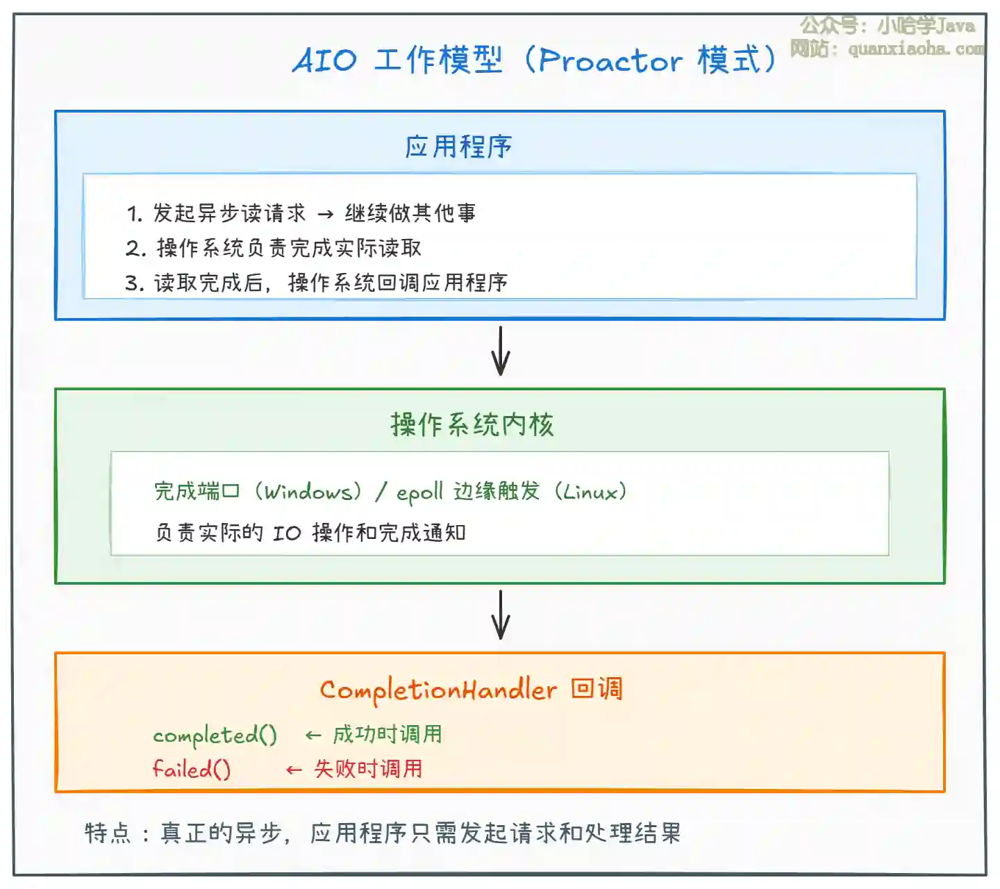 - Proactor 模式:与 NIO 的 Reactor 模式不同,AIO 是 "完成通知" 而非 "就绪通知"