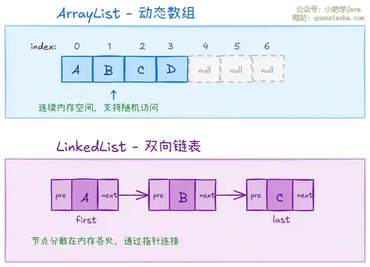ArrayList:使用连续的数组存储元素,每个元素通过下标直接定位。由于内存连续,CPU 缓存命中率高,遍历性能好。但插入删除需要移动后续元素。