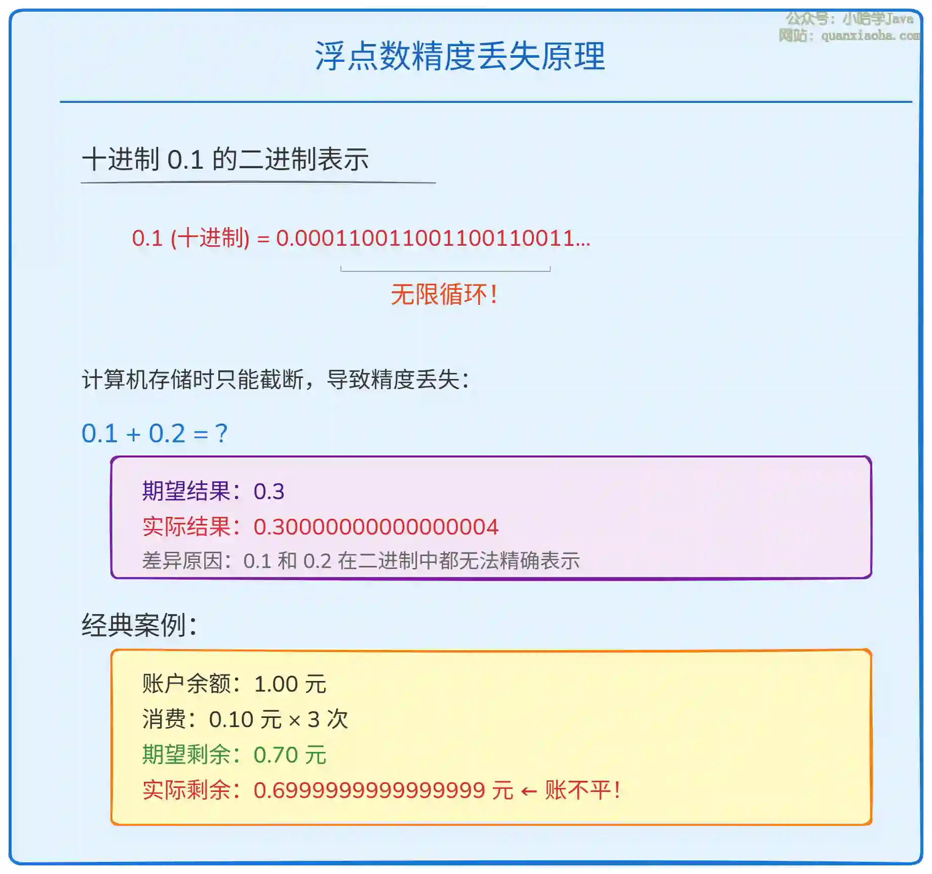 上图展示了浮点数精度丢失的根本原因:十进制小数在二进制中可能是无限循环小数。