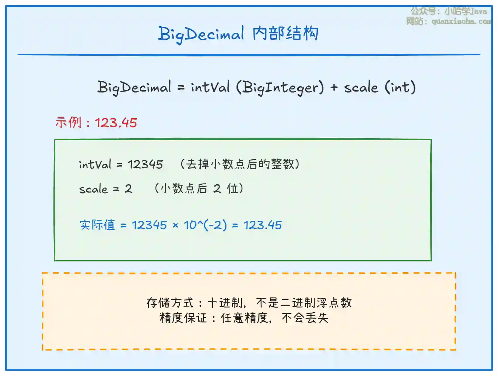 BigDecimal内部将数值存储为整数 + 小数位数,避免了二进制浮点数的精度问题。 -
