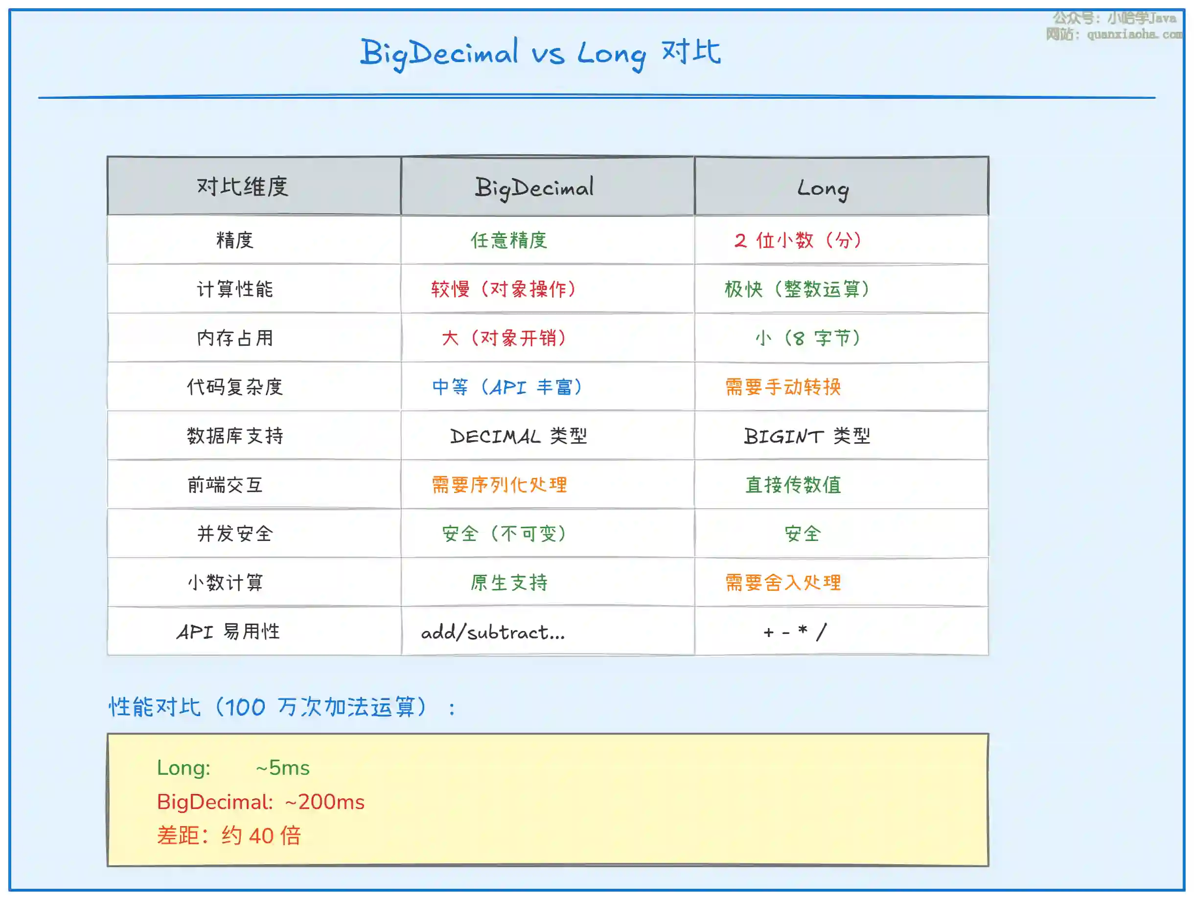 BigDecimal | 复杂金融计算、需要小数精度 | 精度无损失、API 丰富 | 性能较差、代码繁琐 |