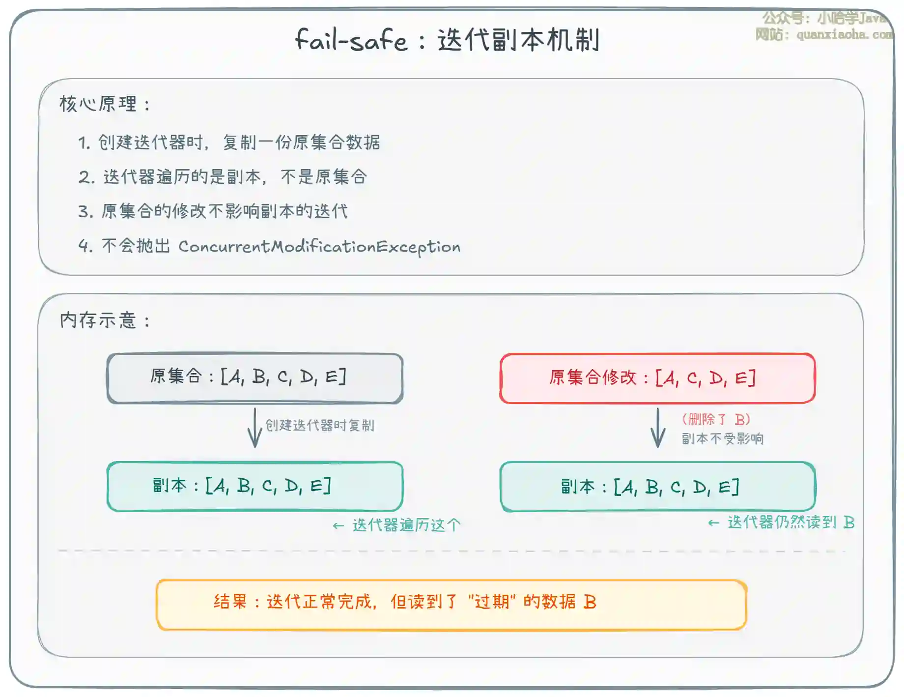 - 迭代副本:创建迭代器时复制原集合数据,迭代器只操作副本