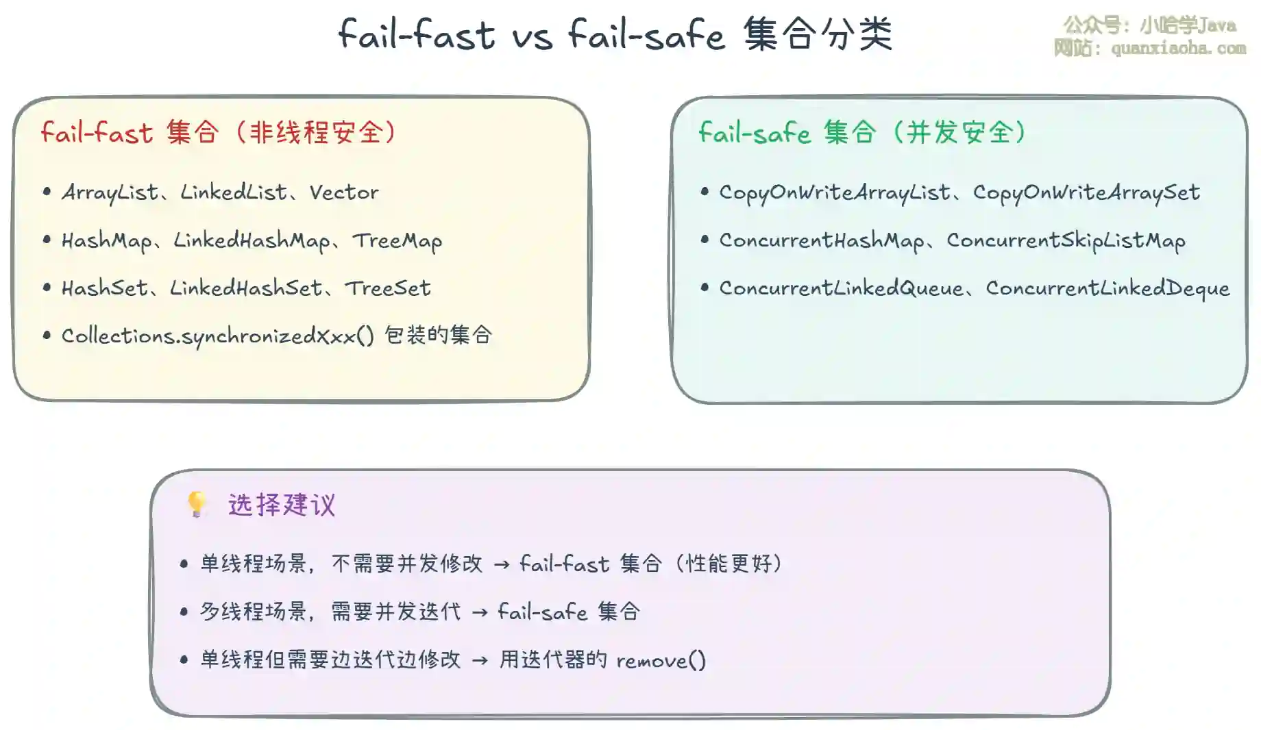 选择:单线程用 fail-fast,多线程用 fail-safe。