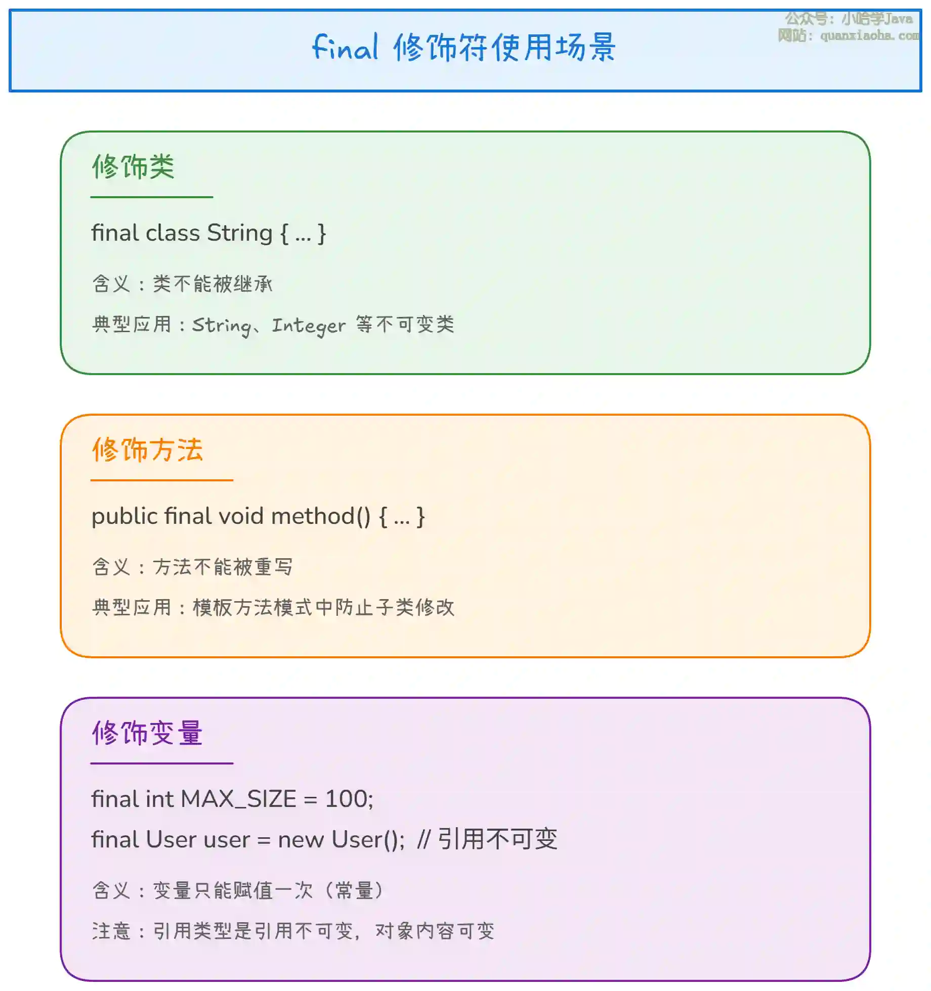修饰变量:变量只能赋值一次,成为常量。对于基本类型,值不可变;对于引用类型,引用不可变但对象内容可以改变。