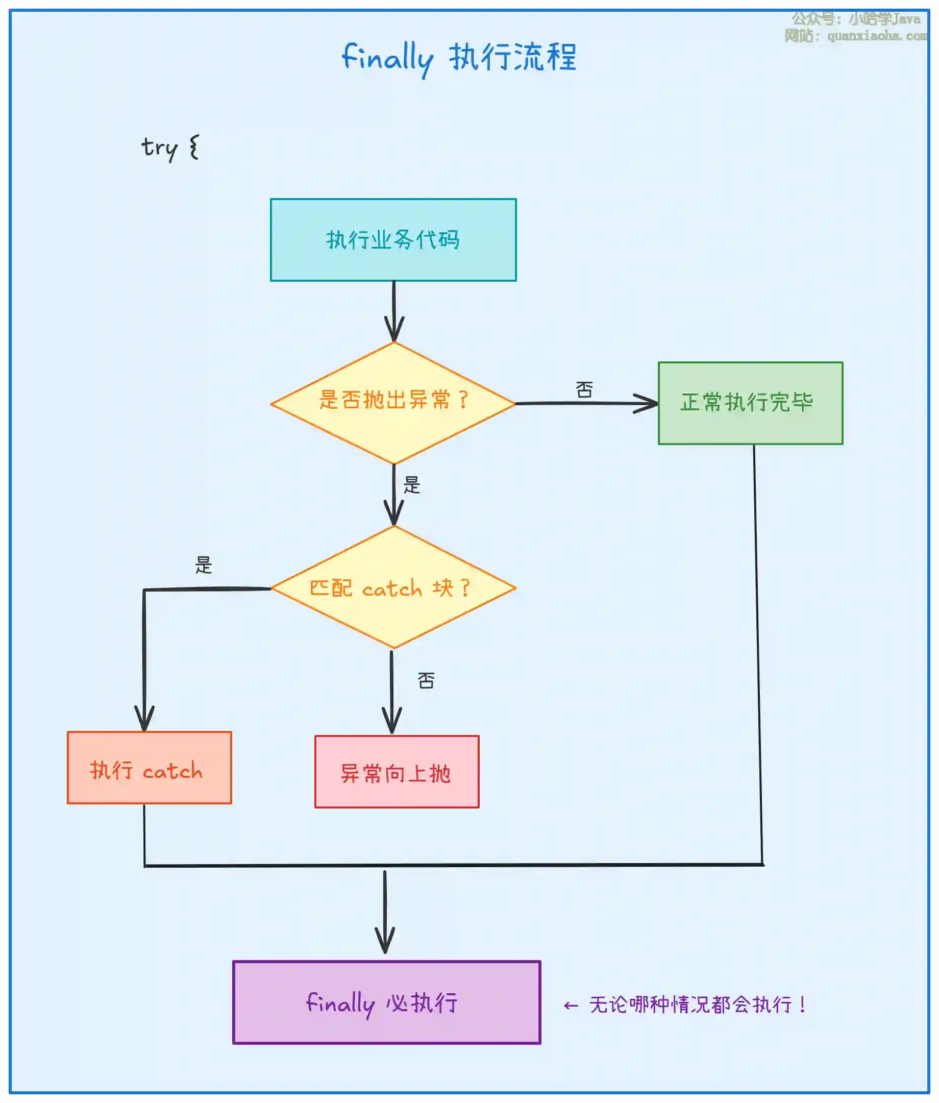 重要规则:如果 finally 中有 return 语句,会覆盖 try 或 catch 中的 return 值。但实际开发中 强烈不建议 在 finally 中使用 return。