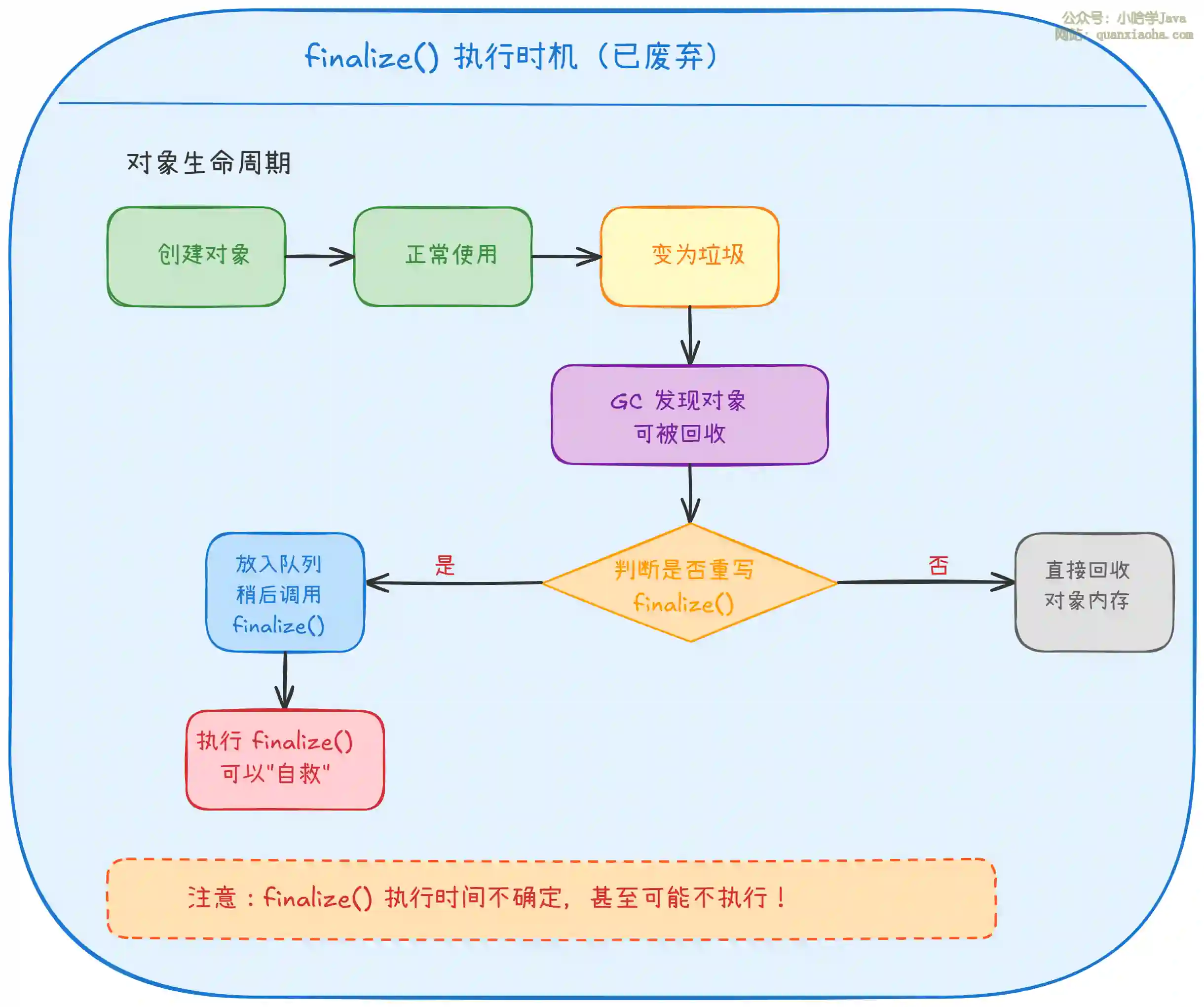 上图展示了 finalize() 的执行时机,但这个机制存在严重问题: