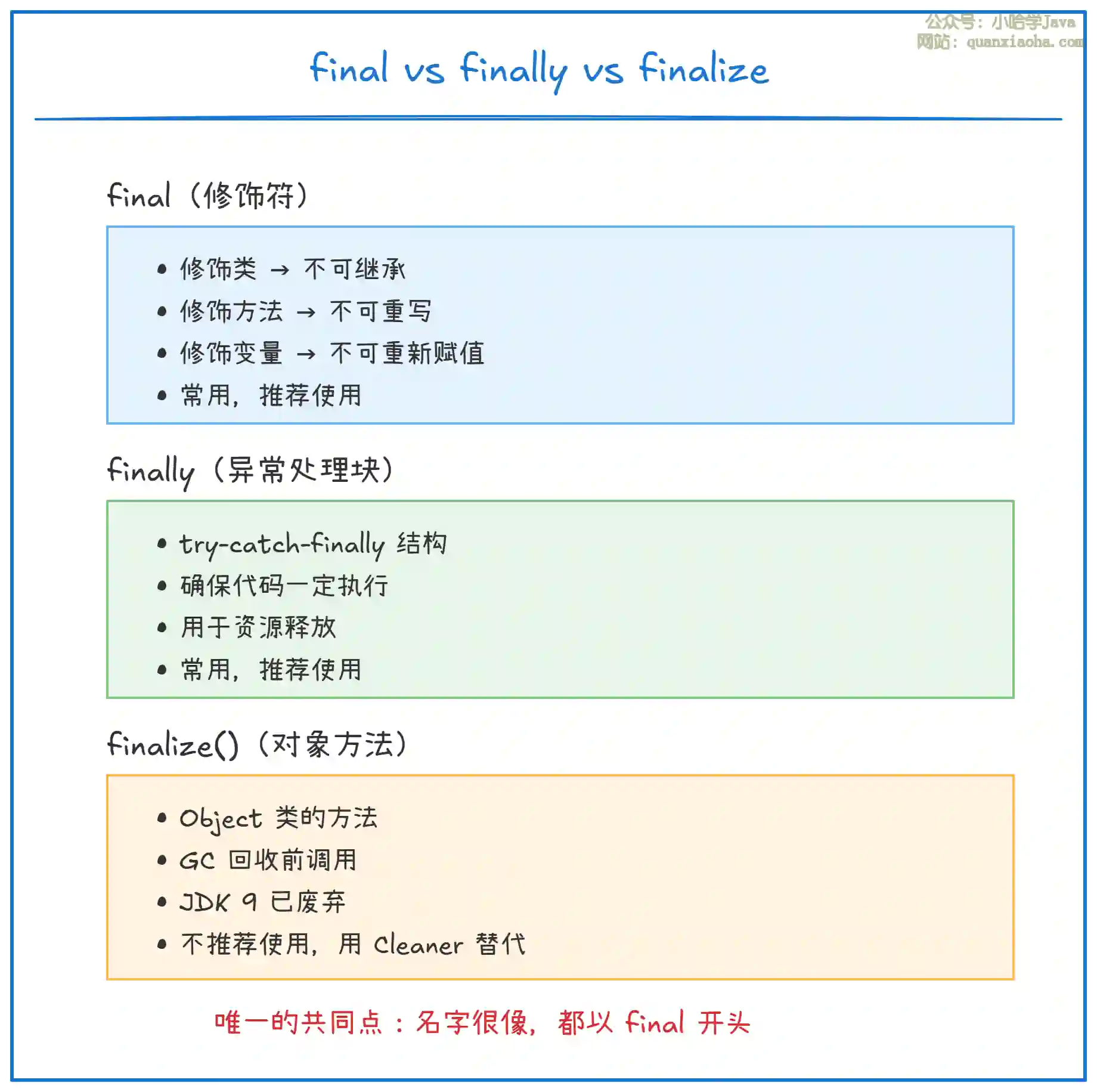 一句话概括:final 修饰不可变,finally 确保必执行,finalize() 回收前调用(已废弃)。