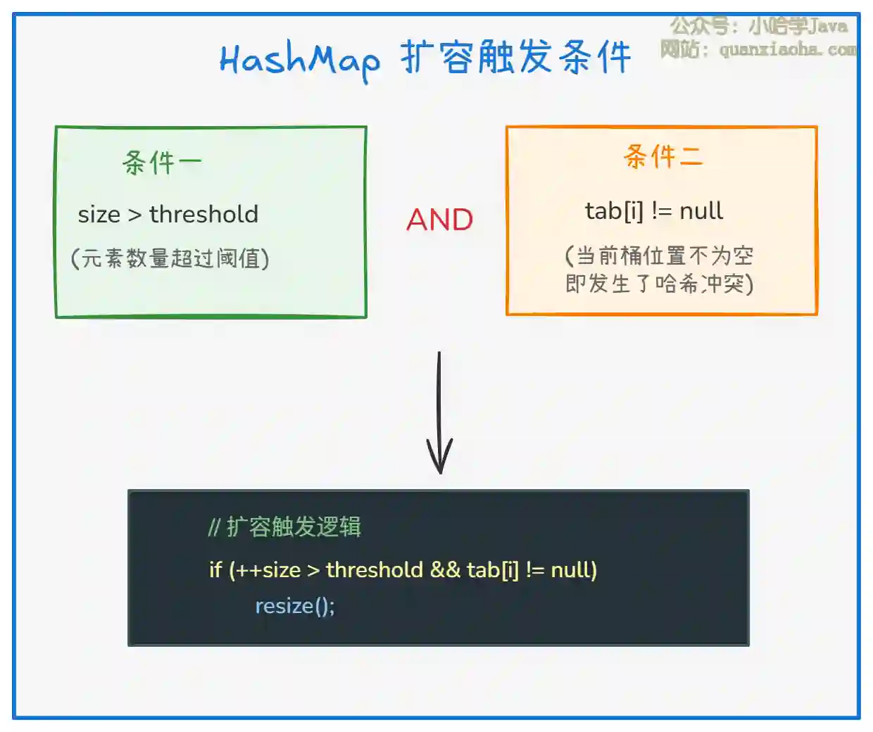 为什么需要两个条件? 这是一个性能优化。如果当前桶为空,直接放入即可,不需要立即扩容。只有当发生哈希冲突时,才考虑扩容以减少冲突概率。