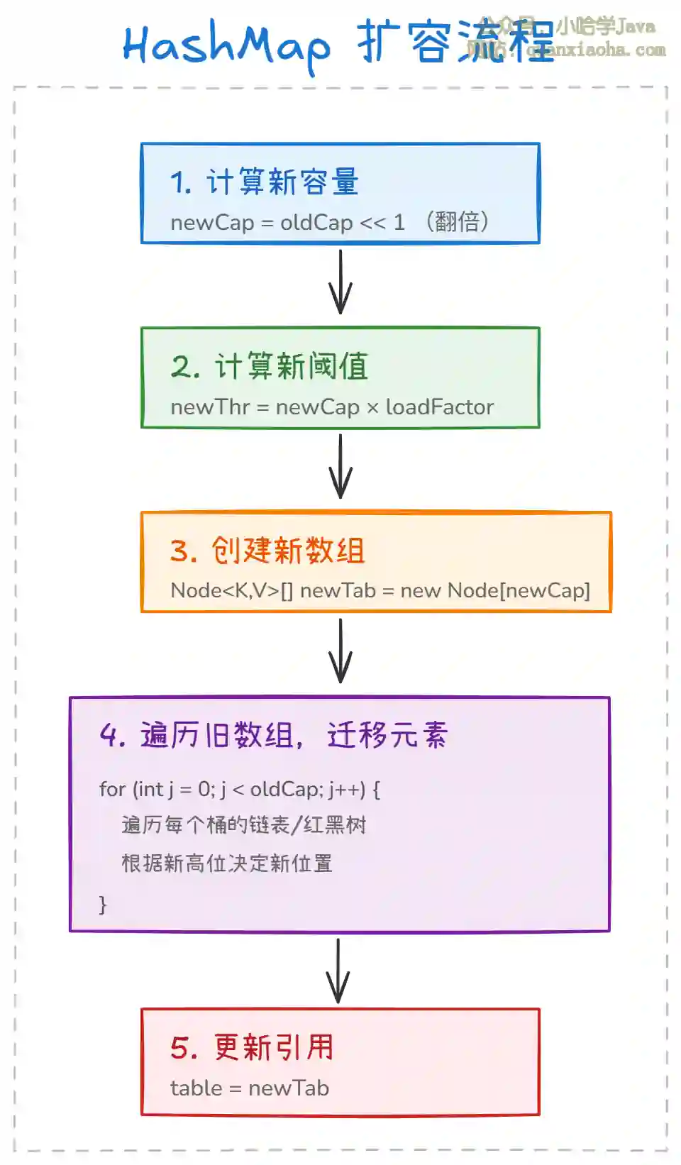 上图展示了 HashMap 扩容的完整流程。整个过程分为 5 个关键步骤: