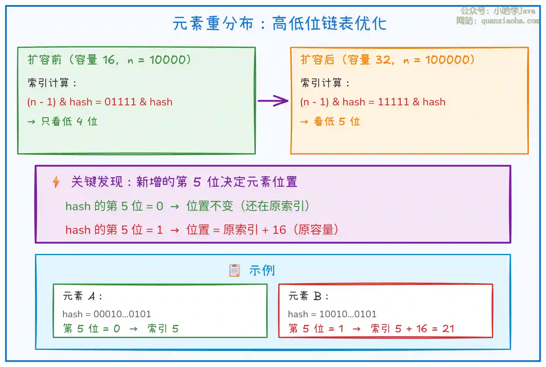 上图揭示了 JDK 1.8 扩容的核心优化。让我详细解释这个精妙的设计: