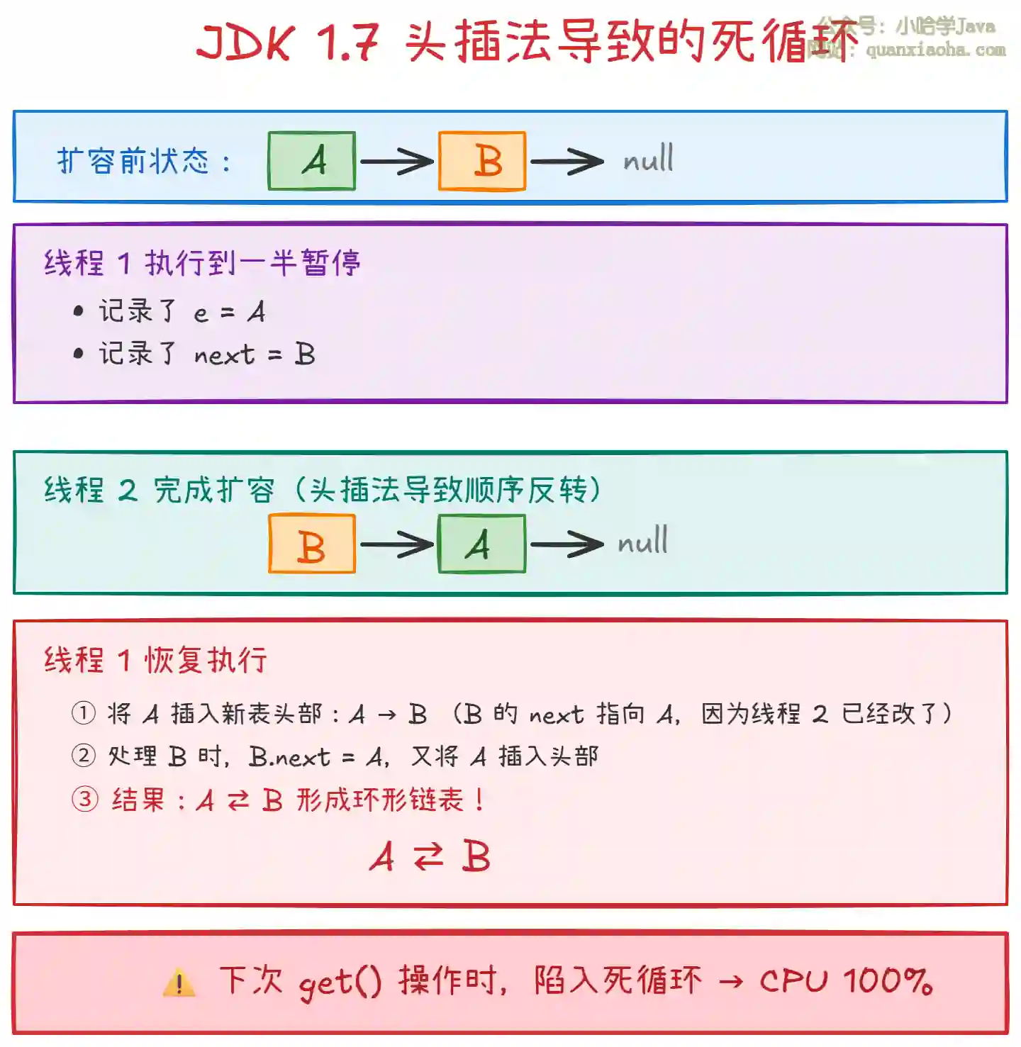 上图解释了 JDK 1.7 的经典死循环问题。关键点: