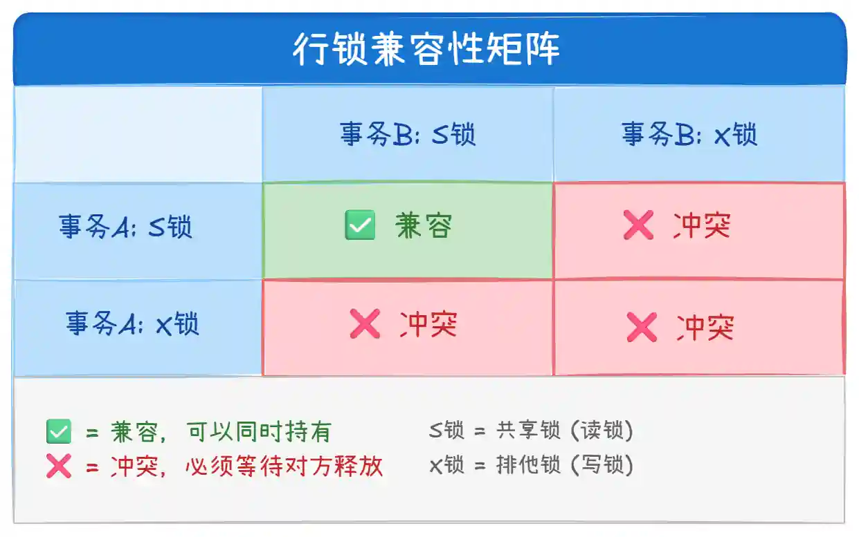 - S 锁 + X 锁 = 冲突:一个事务在读(S 锁),另一个事务想写(X 锁),必须等待