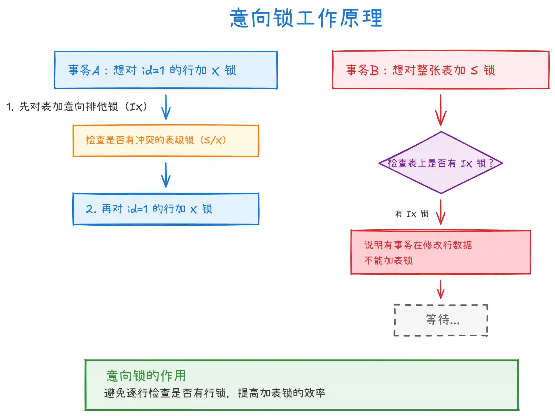 - IX 和 S 冲突:有事务想修改行(IX),另一个事务想读整表(S),需要等待