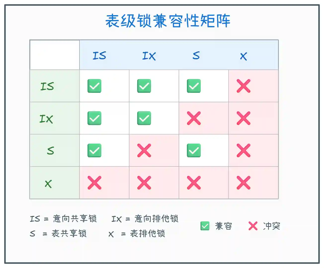 上图展示了共享锁(S 锁)和排他锁(X 锁)的兼容关系: