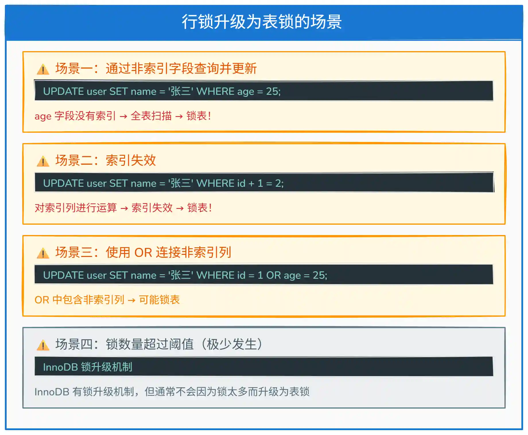 WHERE条件无法使用索引或索引失效时,MySQL 会进行全表扫描,此时FOR UPDATE会锁住所有扫描到的行,效果等同于锁表。解决方法是确保查询走索引。 -