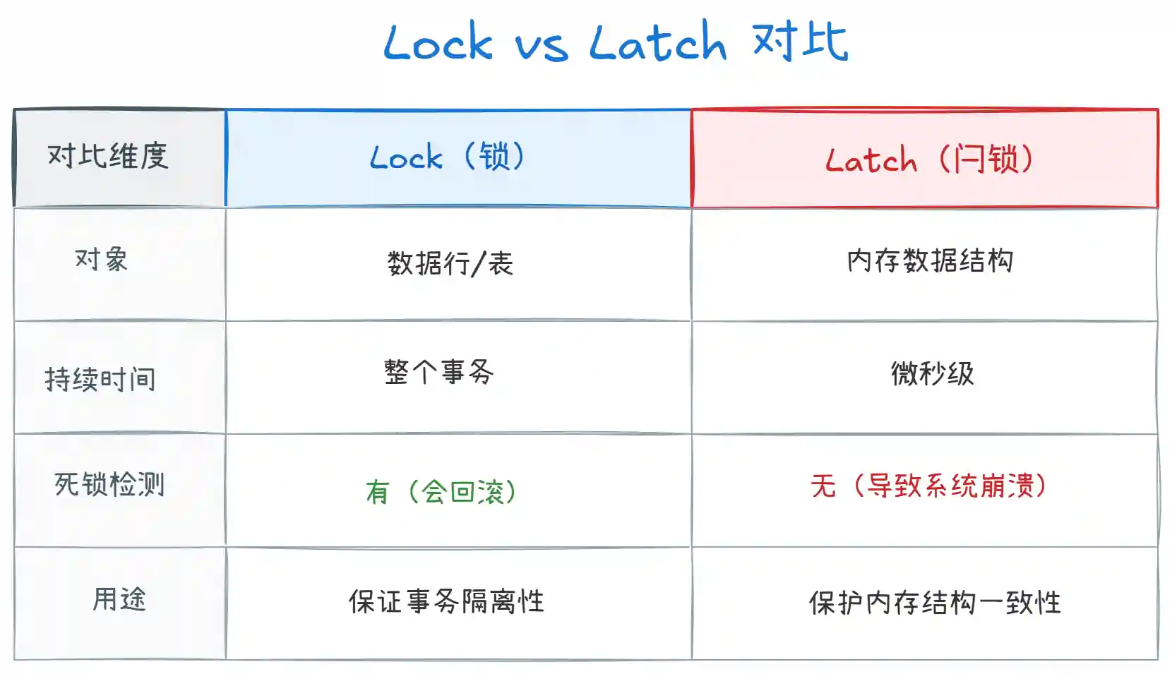 - Latch(闩锁):内存层面的锁,用于保护内存数据结构(如 B+ 树页面),持有时间极短(微秒级)