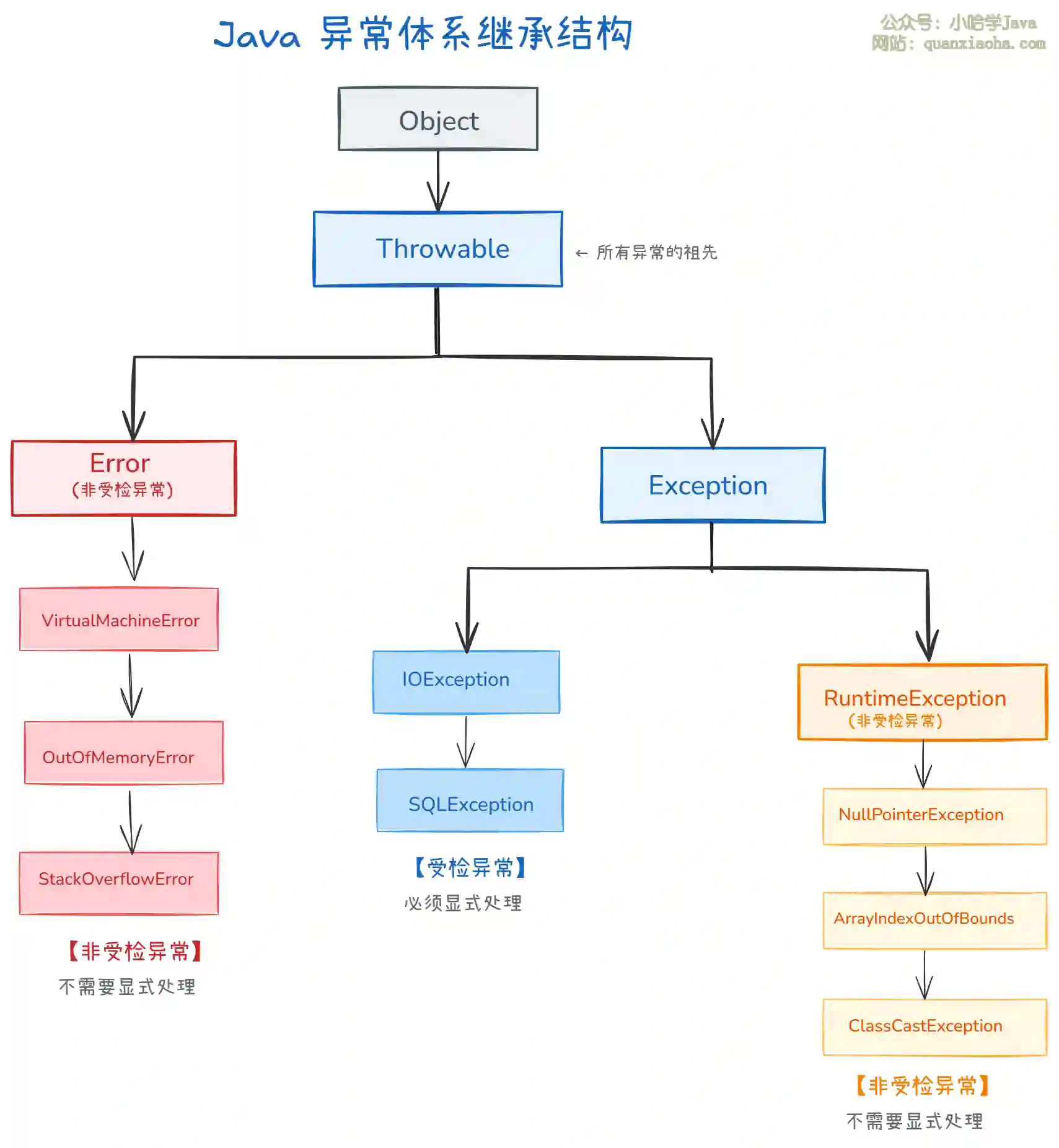 上图展示了 Java 异常体系的完整继承结构。关键要点: