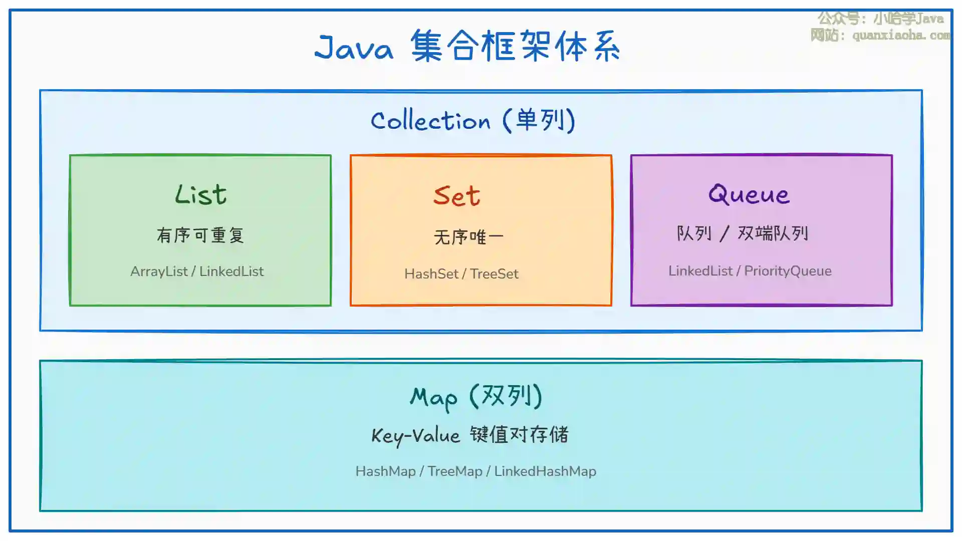 Map 体系:存储键值对(Key-Value),通过 Key 快速查找 Value,Key 必须唯一。