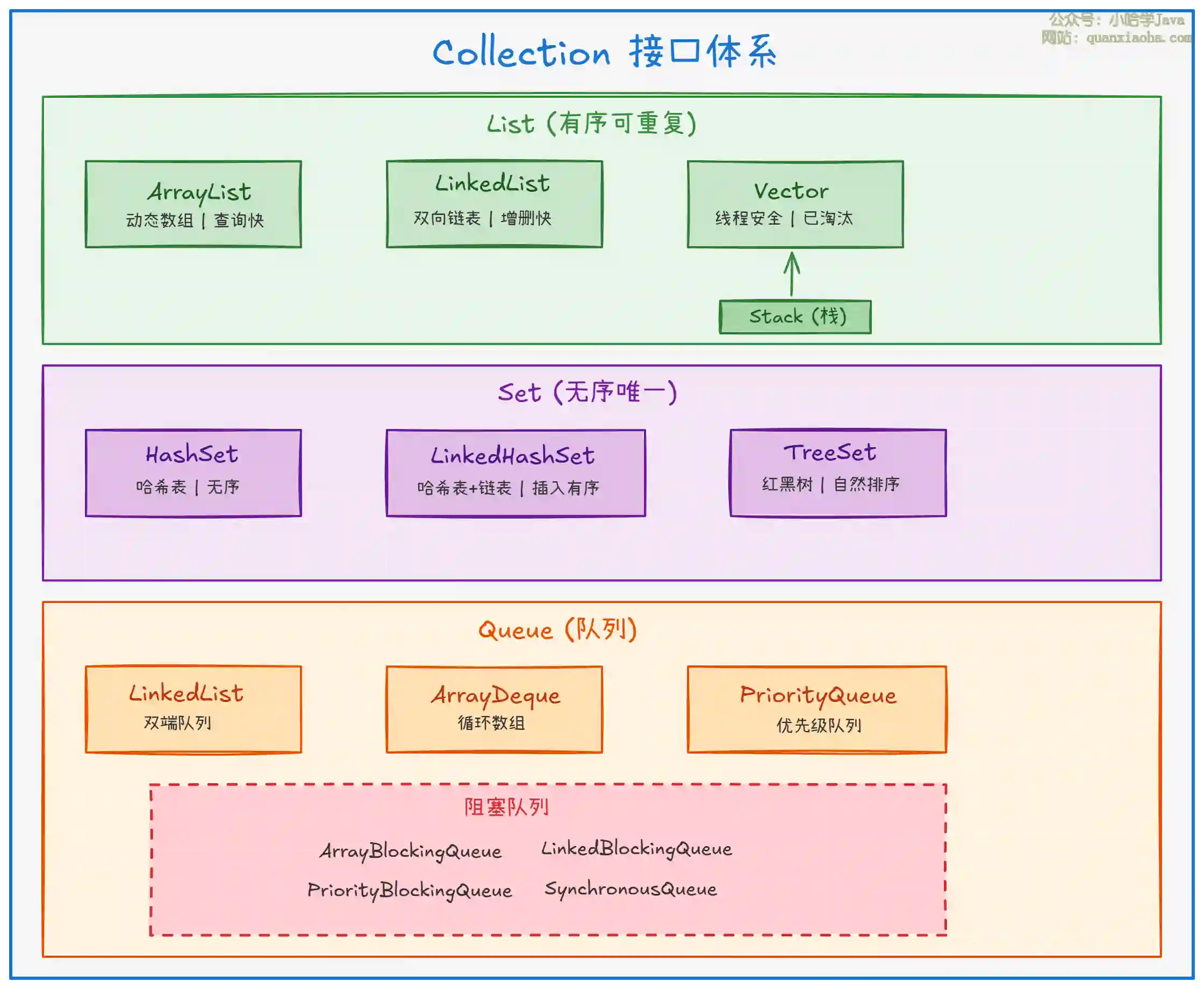 List(有序可重复)、Set(无序唯一)、Queue(队列)三大接口。 -