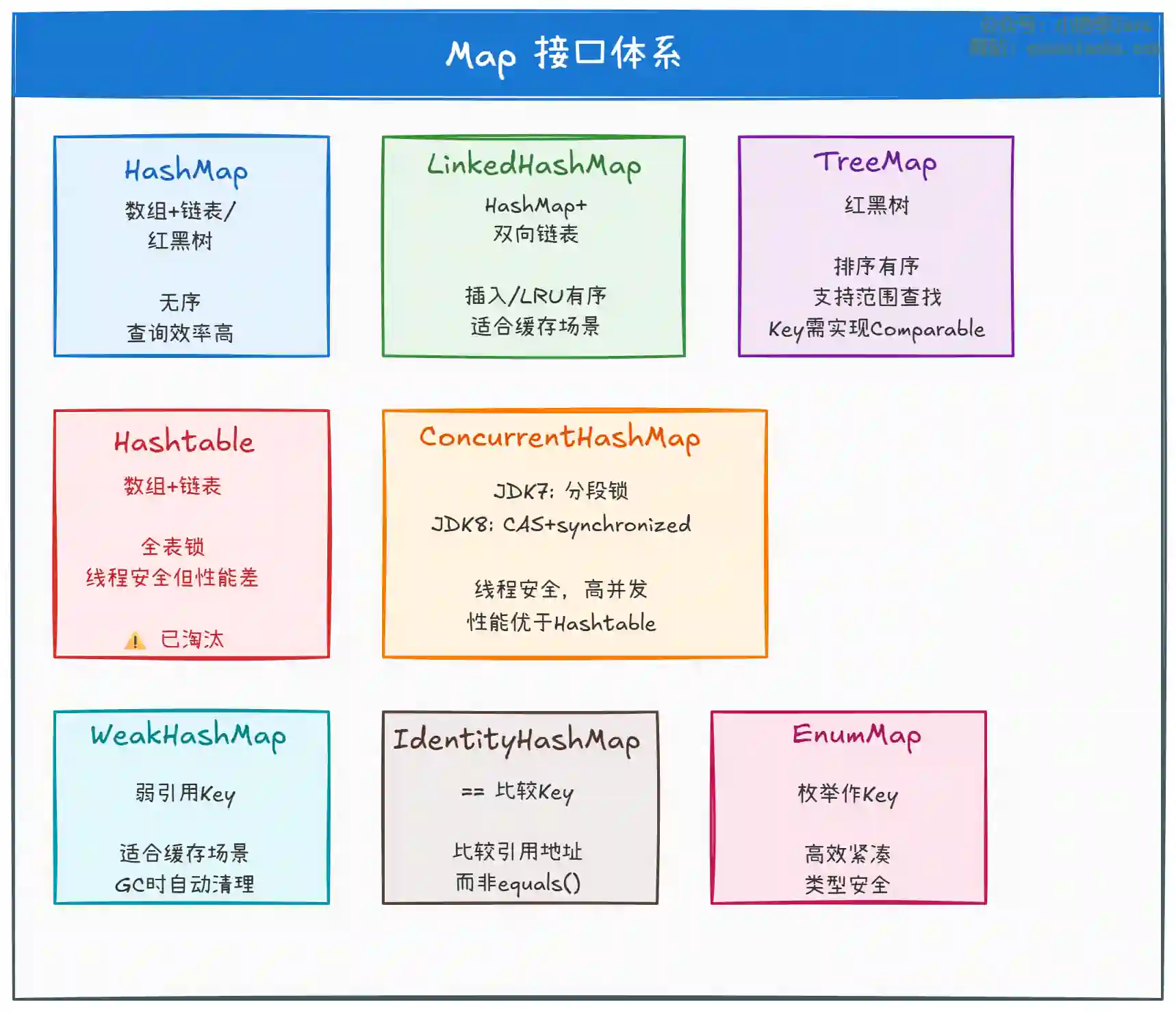 ConcurrentHashMap | 数组 + 链表/红黑树 | ✅ | ❌/❌ | 高并发首选,细粒度锁 |
