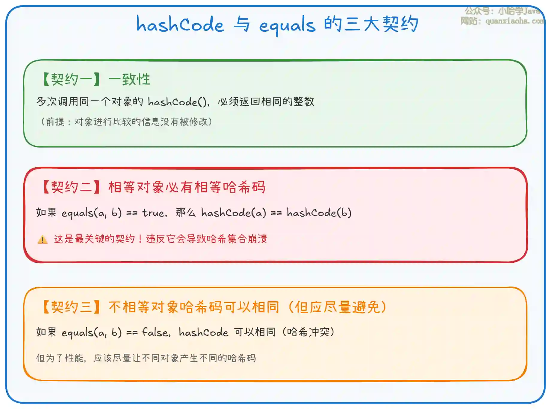| 只重写 equals | 比较内容 | 基于地址(不同) | ❌ 违反契约 |