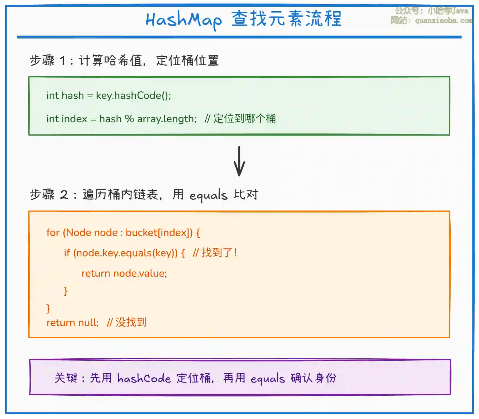 上图展示了 HashMap 查找元素的完整流程。关键要点: