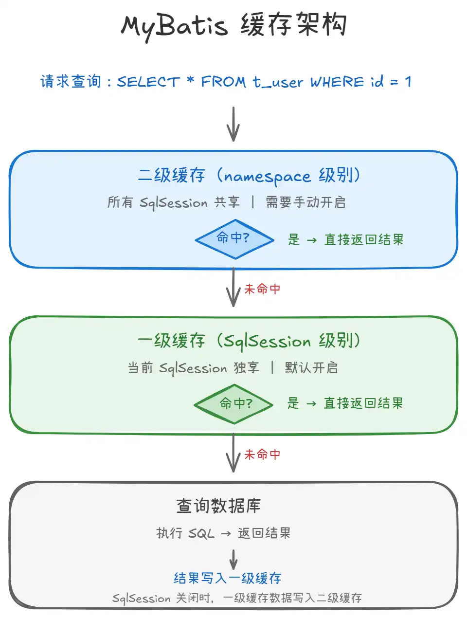 MyBatis 的缓存查询遵循 "先查二级,再查一级,最后查数据库" 的顺序: