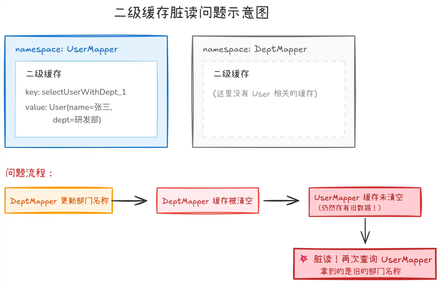 UserMapper的二级缓存并不知道部门信息变了,再次查询selectUserWithDept仍然返回旧的部门名称
