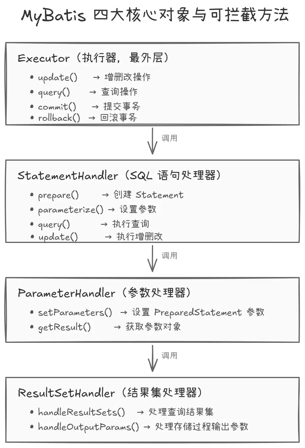 MyBatis 在执行一条 SQL 时,会依次经过上面四个核心对象。每个对象都有明确的职责分工: