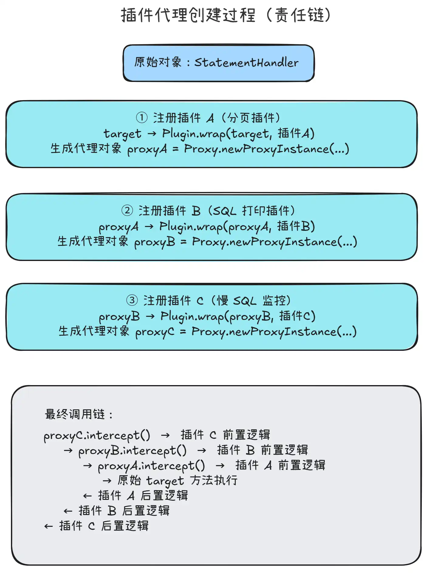 proxyB再被插件 C(慢 SQL 监控)包装,生成最终代理对象proxyC。