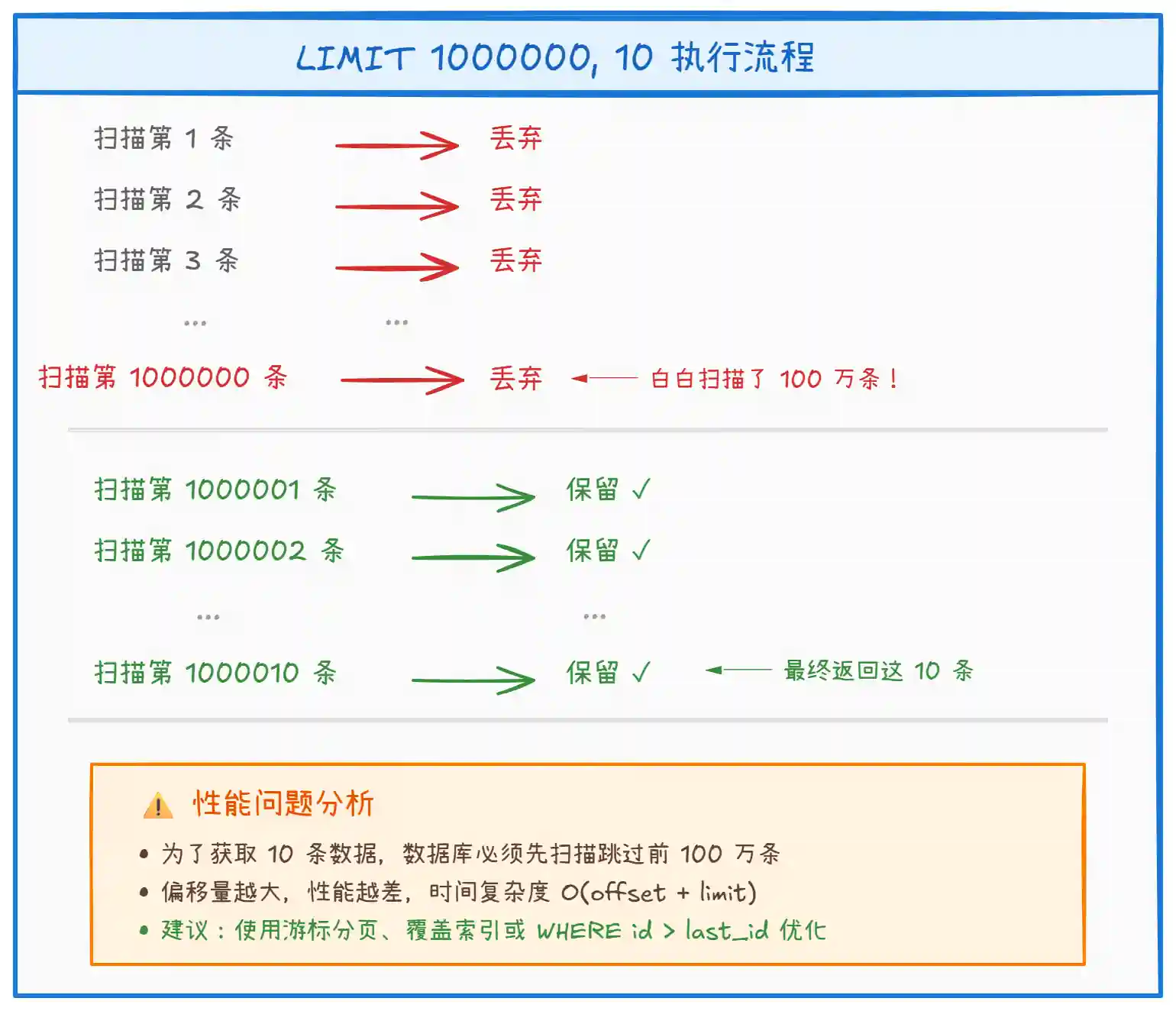 1000000 + 10 = 1000010条记录,而不是只扫描 10 条 - 丢弃浪费:前 100 万条记录全部被扫描后丢弃,做了无用功