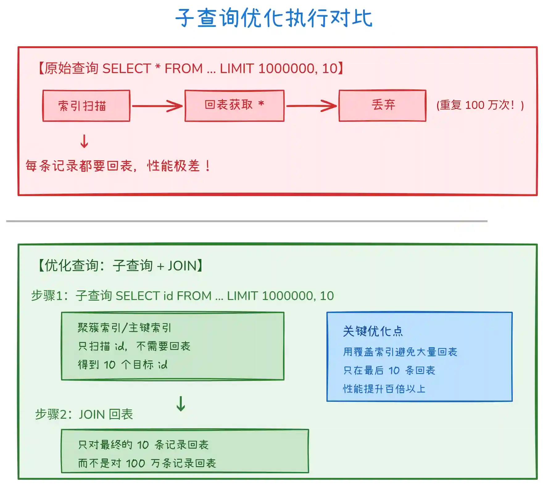 SELECT *,每条记录都要回表获取完整数据,代价更大 - 时间复杂度:O(offset + size),offset 越大,性能越差
