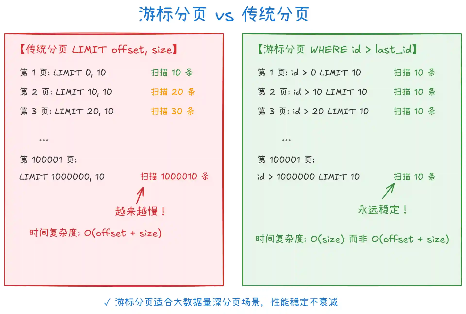 上图对比了传统分页和游标分页的性能差异。关键优势在于: