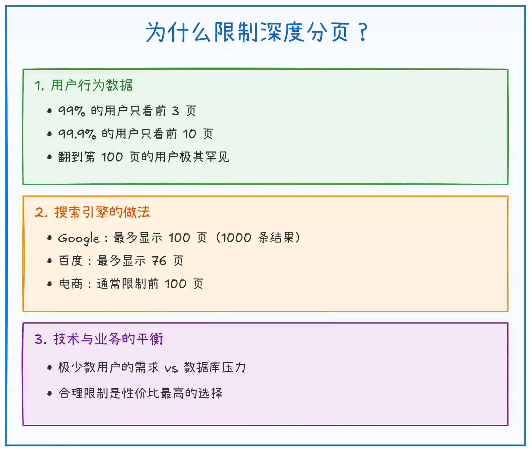| 业务限制 | 限制最大页数,禁止深度跳页 | 搜索引擎类场景 | ⭐⭐⭐ |