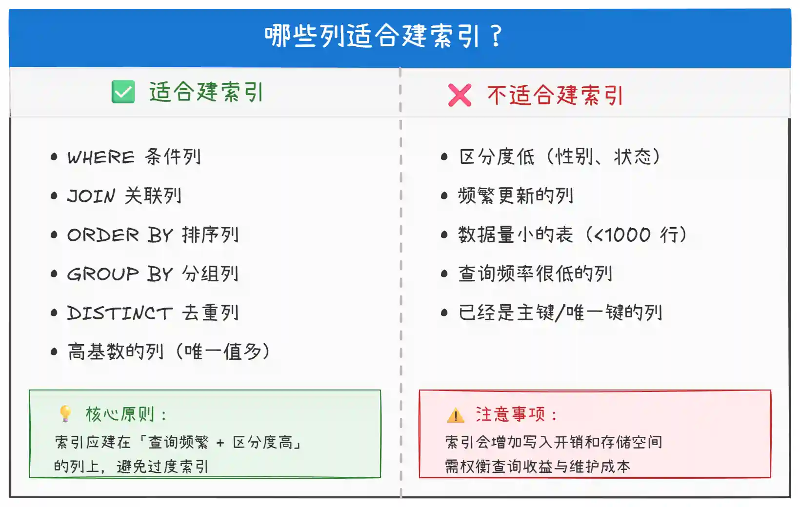 | 选择合适的列 | WHERE、JOIN、ORDER BY、GROUP BY 列优先 | 高频查询列 |