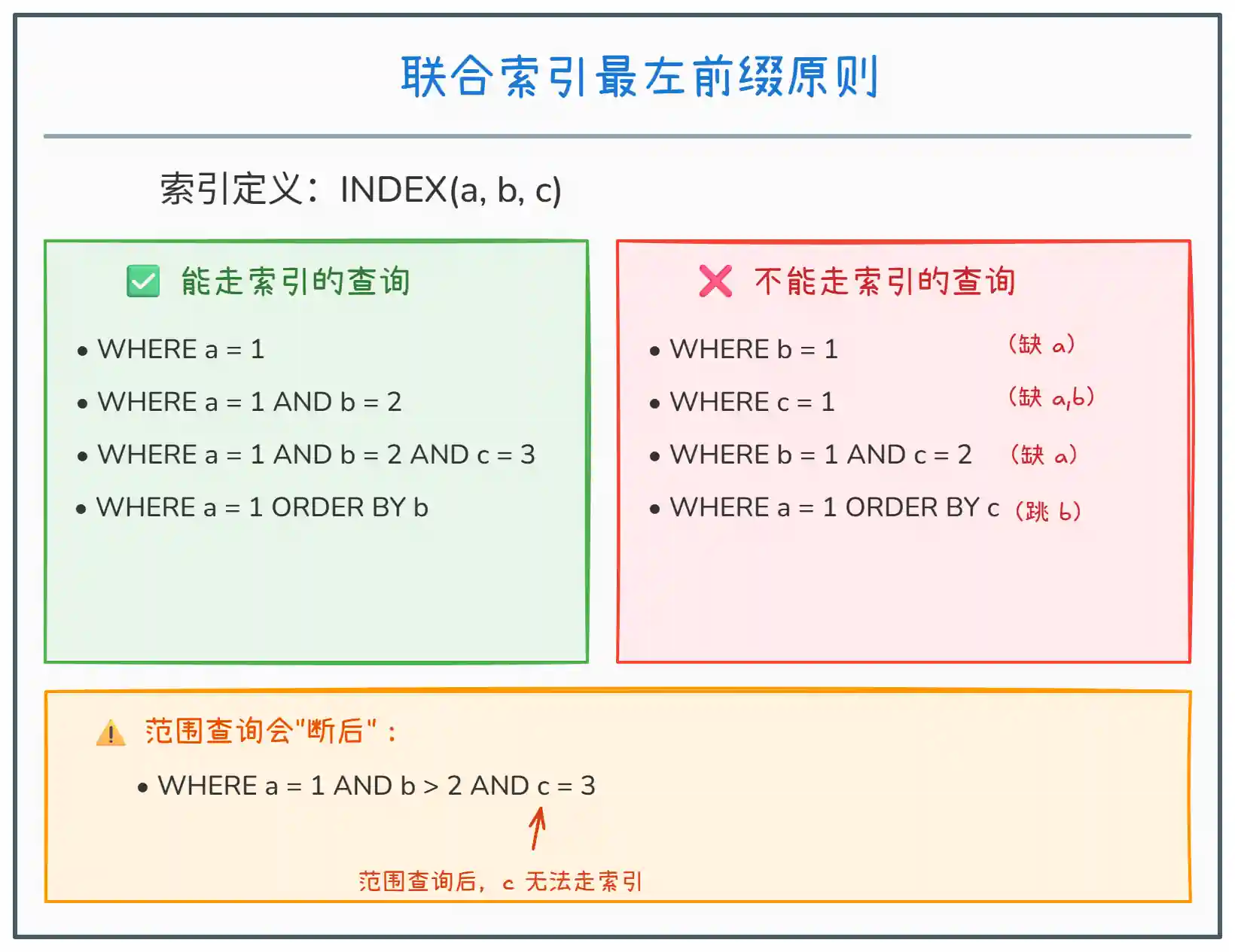 | 最左前缀原则 | 联合索引按顺序匹配,从左到右连续使用 | 范围查询断后 |
