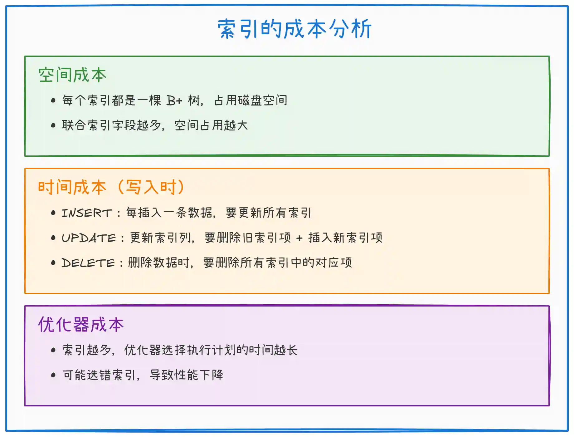 空间成本:每个索引都是一棵独立的 B+ 树,会占用额外的磁盘空间。联合索引字段越多,空间占用越大。