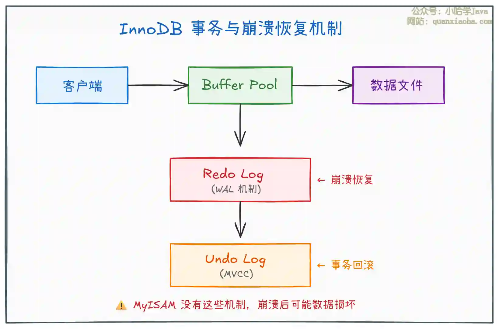 上图展示了 InnoDB 的事务与崩溃恢复机制,核心要点如下: