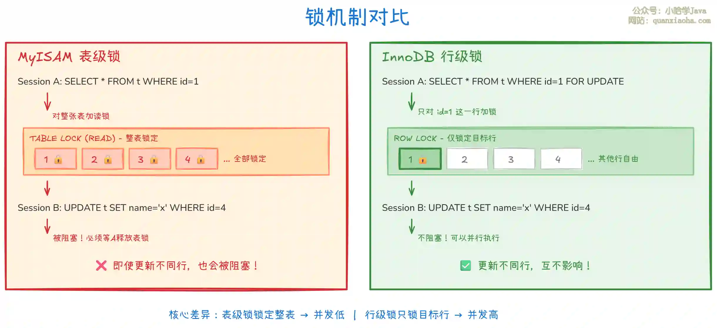 上图对比了两种存储引擎的锁机制,核心差异如下: