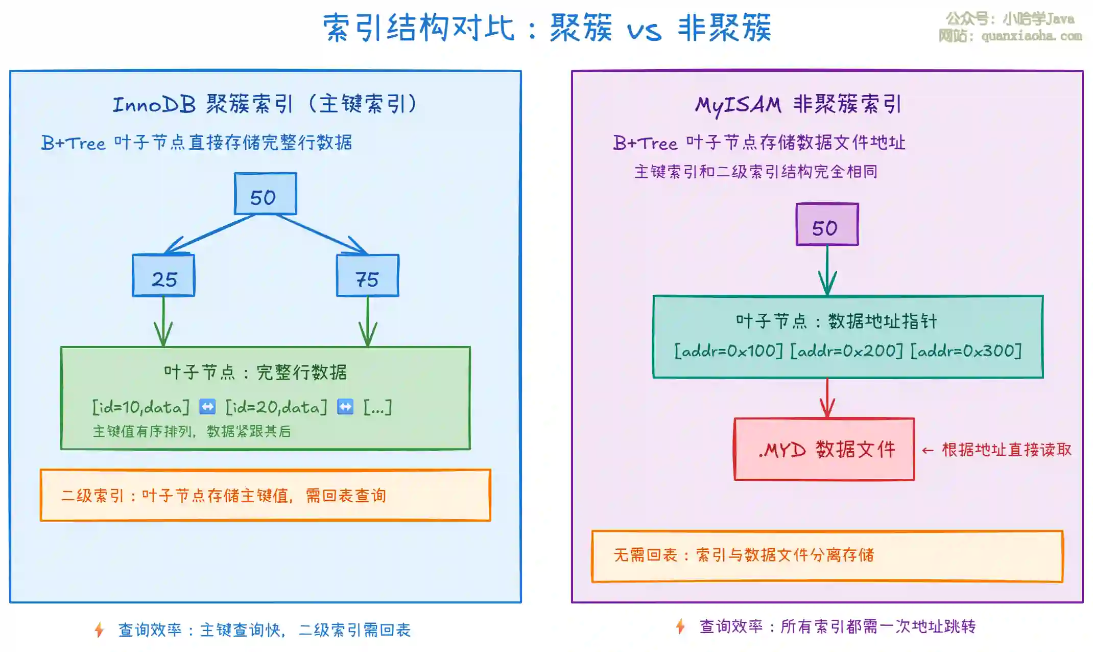 InnoDB:主键是聚簇索引,叶子节点存完整数据;二级索引存主键值MyISAM:所有索引都是非聚簇的,叶子节点存数据文件地址
