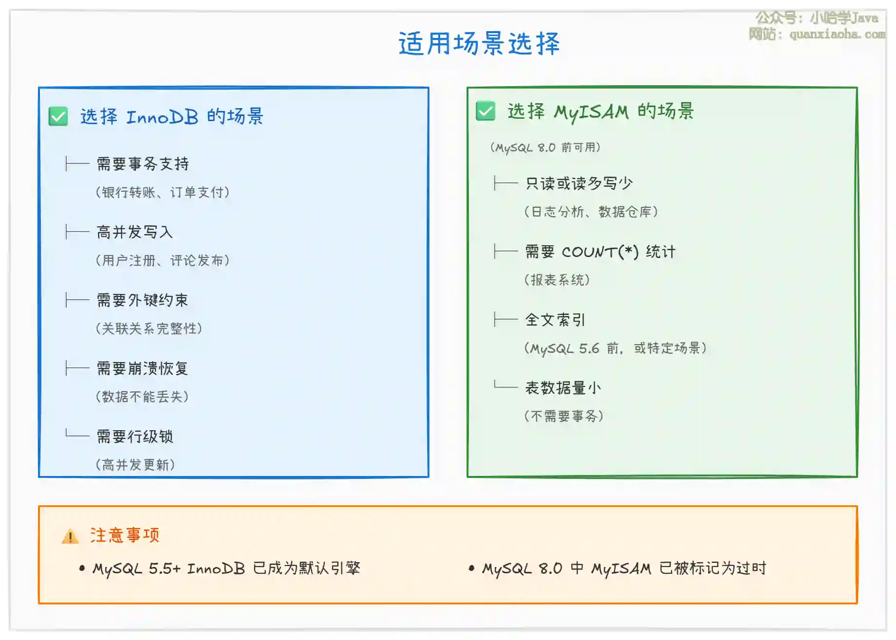 架构设计能力:考察你是否清楚不同引擎在事务、锁、索引、崩溃恢复等方面的差异,能否根据业务特点(读多写少、高并发、强一致性等)选择合适的引擎。