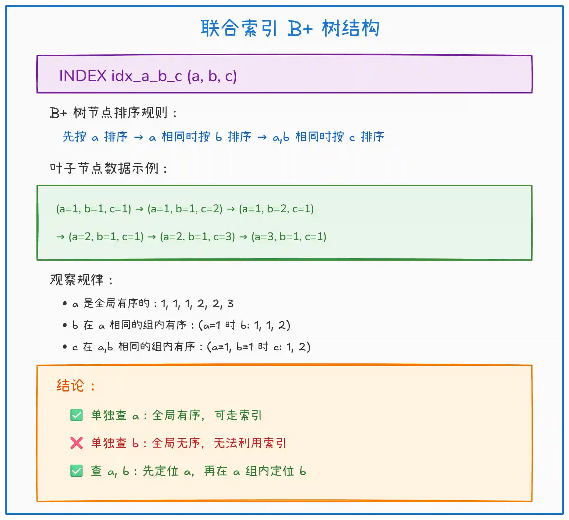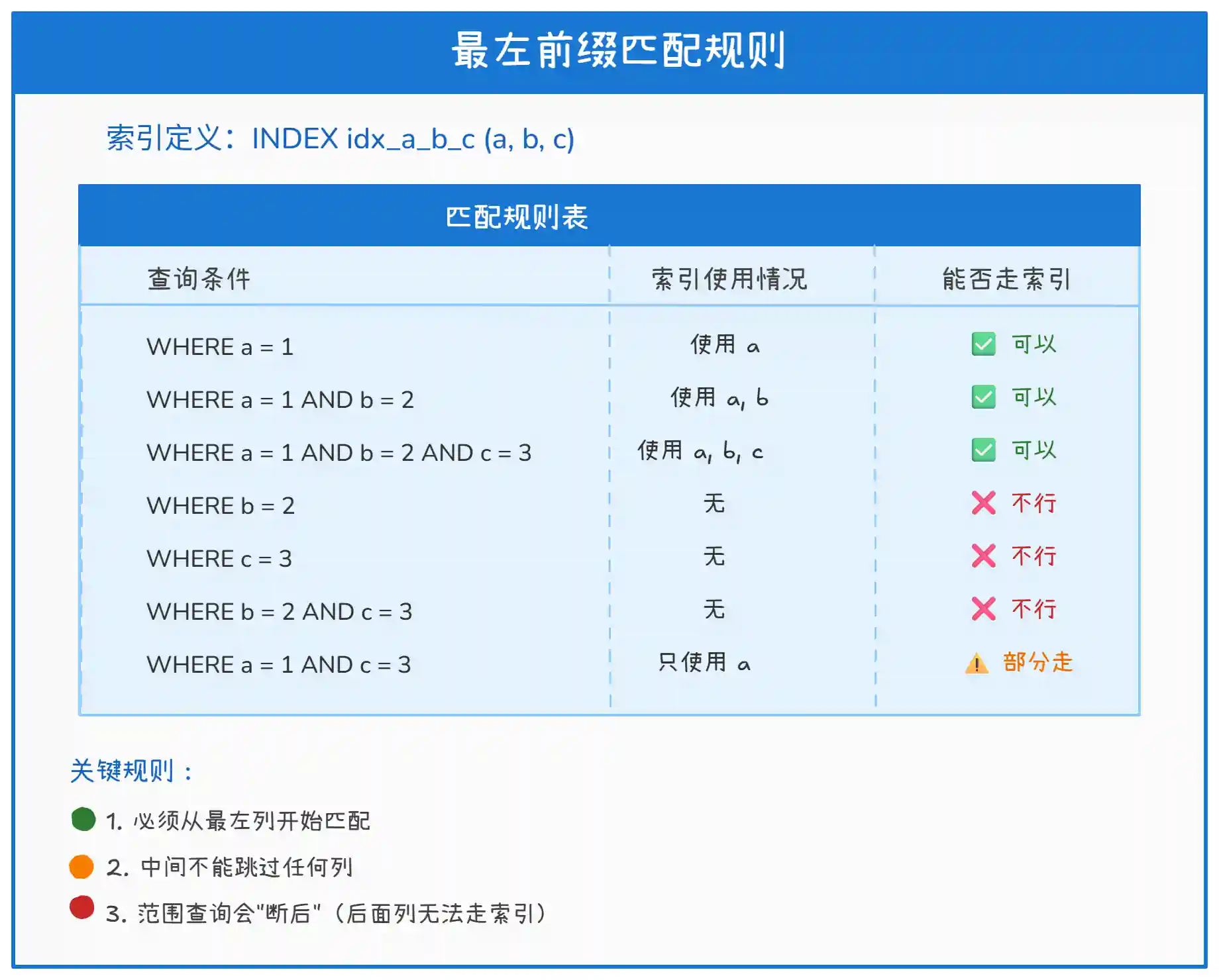 为什么要遵守:联合索引的 B+ 树是按照定义顺序构建的,先按第一列排序,第一列相同再按第二列排序,以此类推。跳过前面的列就无法利用索引的有序性。