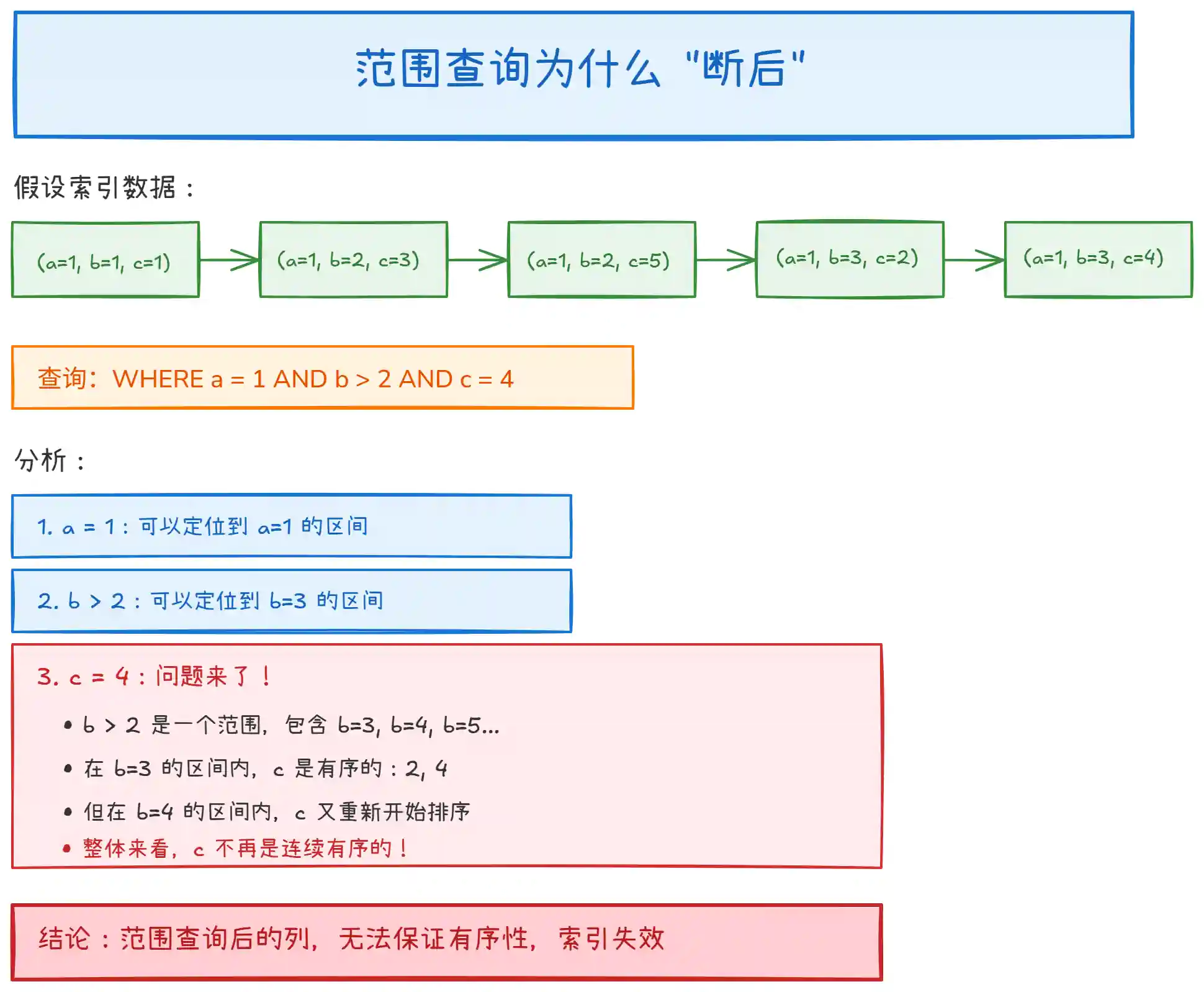 上图解释了范围查询 "断后" 的底层原因。核心问题: