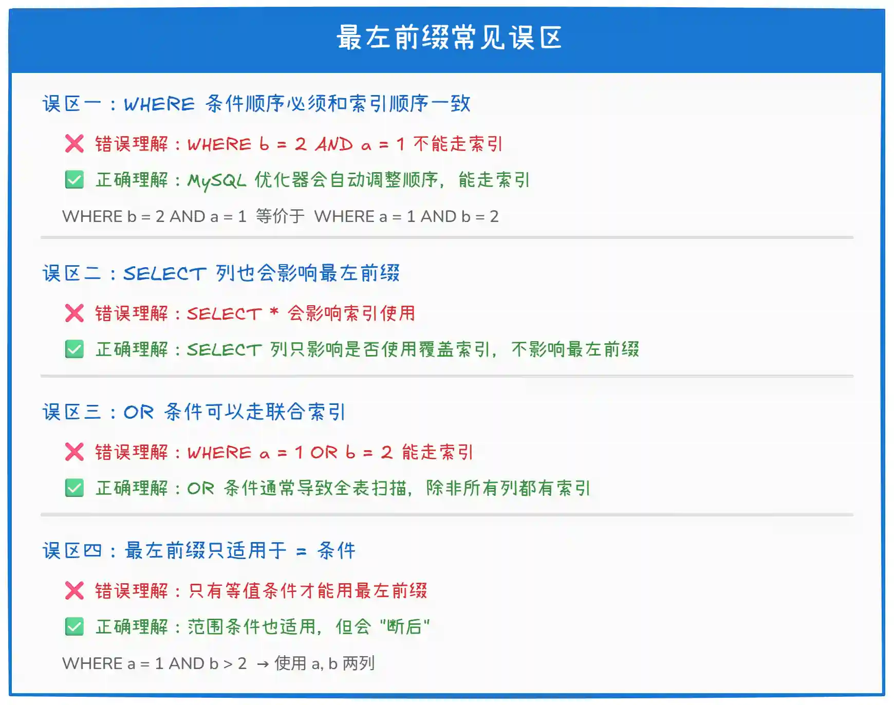 上图总结了最左前缀原则的常见误区。关键澄清: