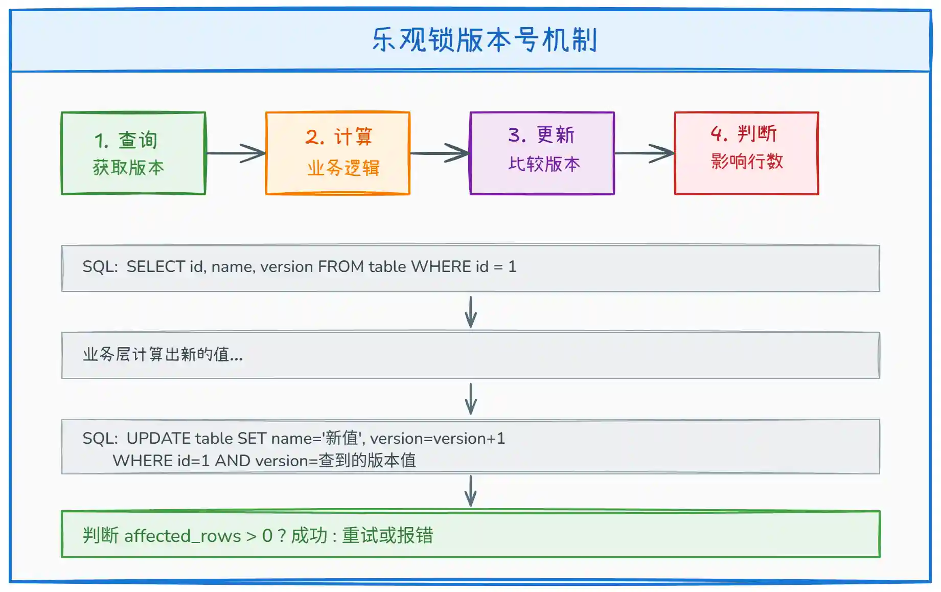 affected_rows(影响行数),如果大于 0 说明更新成功;如果等于 0 说明版本号已被其他事务修改,需要重试或报错