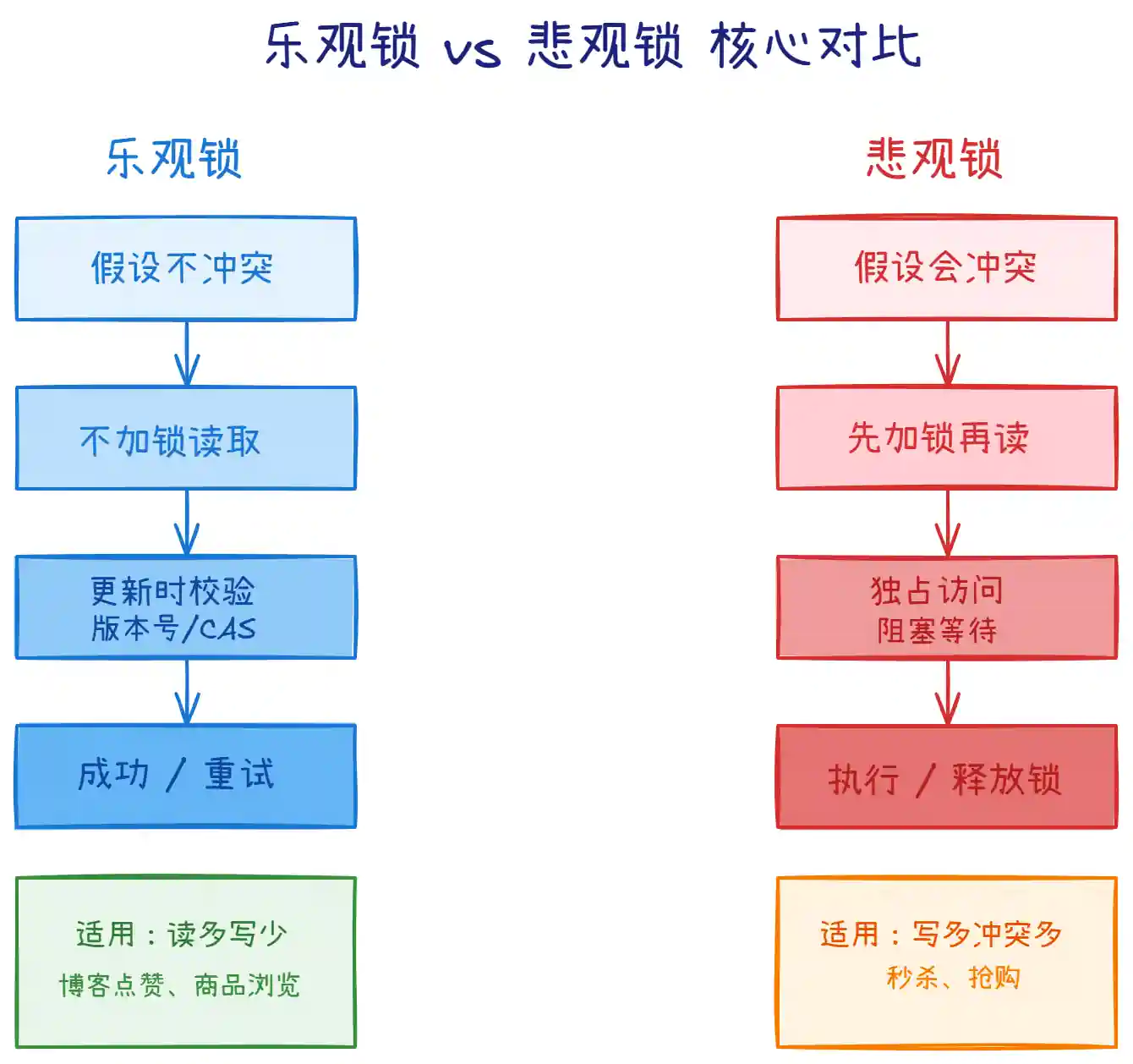 | 适用场景 | 读多写少、冲突较少 | 写多读少、冲突频繁 |