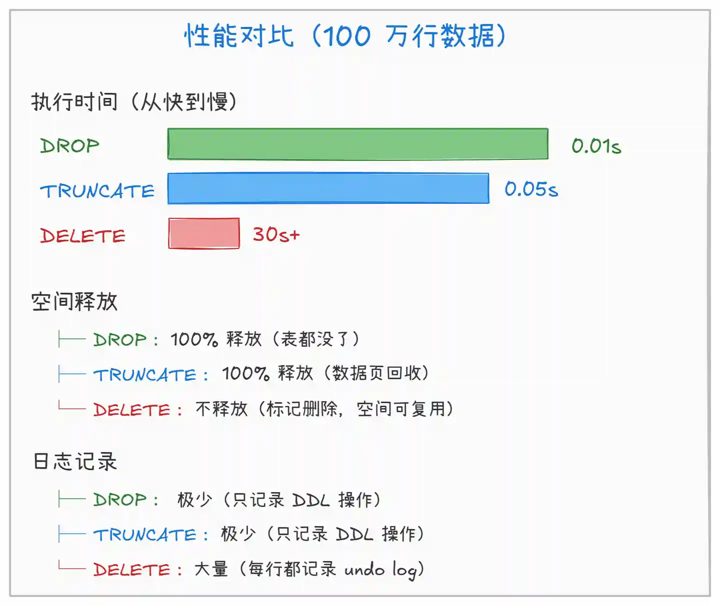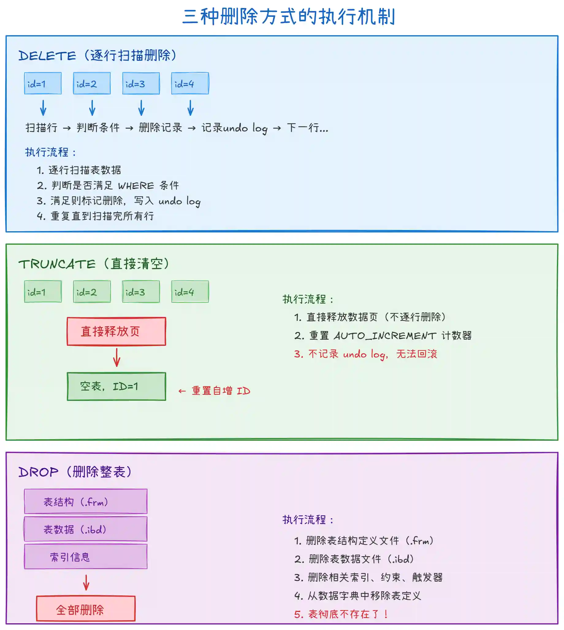 | 空间释放 | 不释放,可复用 | ✅ 释放页空间 | ✅ 全部释放 |