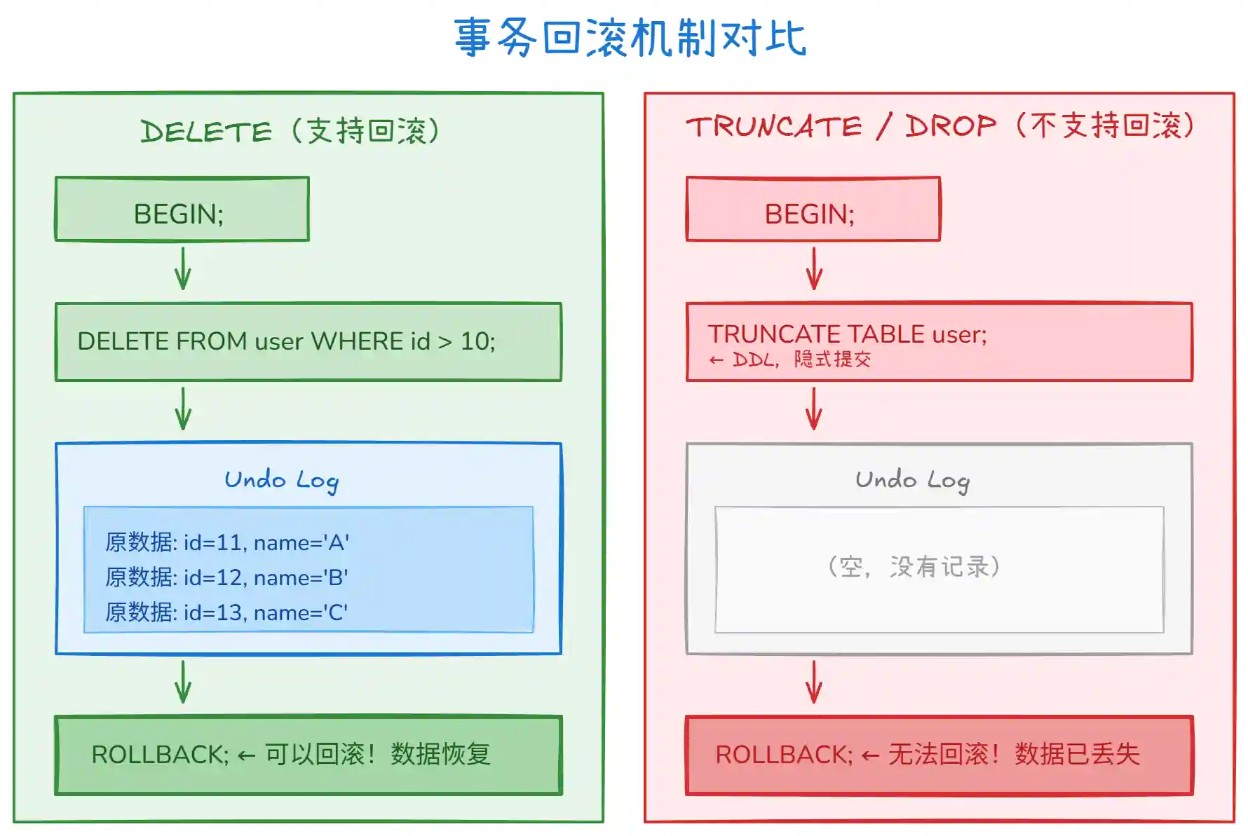 | 事务回滚 | ✅ 支持(需在事务中) | ❌ 不支持 | ❌ 不支持 |